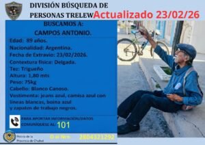 Antonio Campos, de 89 años, y vecino de Trelew, se encuentra desaparecido desde el pasado lunes 23 de febrero. Ese día, habría salido de su casa, y por motivos aún no establecidos, no regresó a su casa. La policía de Chubut cree que por una patología cognitiva que padece se podría haber desorientado.
