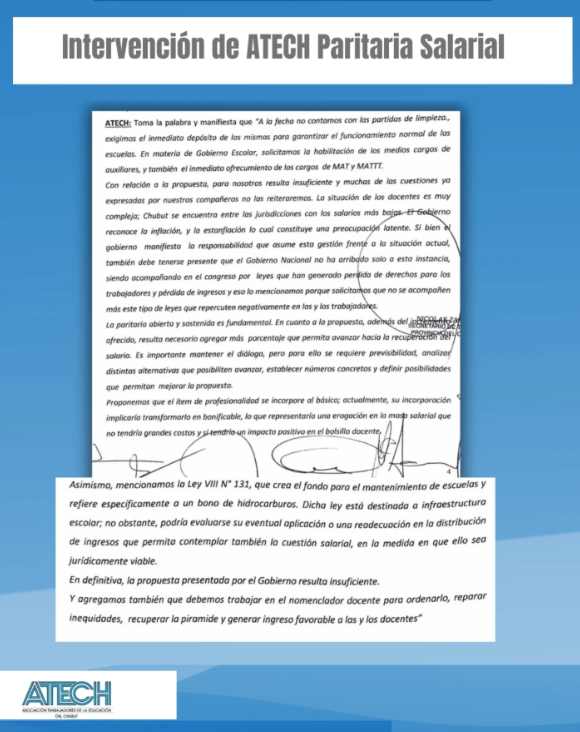 La Asociación de Trabajadores de la Educación de Chubut (ATECH) rechazó el ofrecimiento salarial presentado por el Gobierno provincial en la reunión paritaria realizada este 25 de febrero, al considerarlo insuficiente. En ese marco, el gremio expuso una serie de propuestas concretas orientadas a mejorar los salarios y las condiciones de funcionamiento en las escuelas.