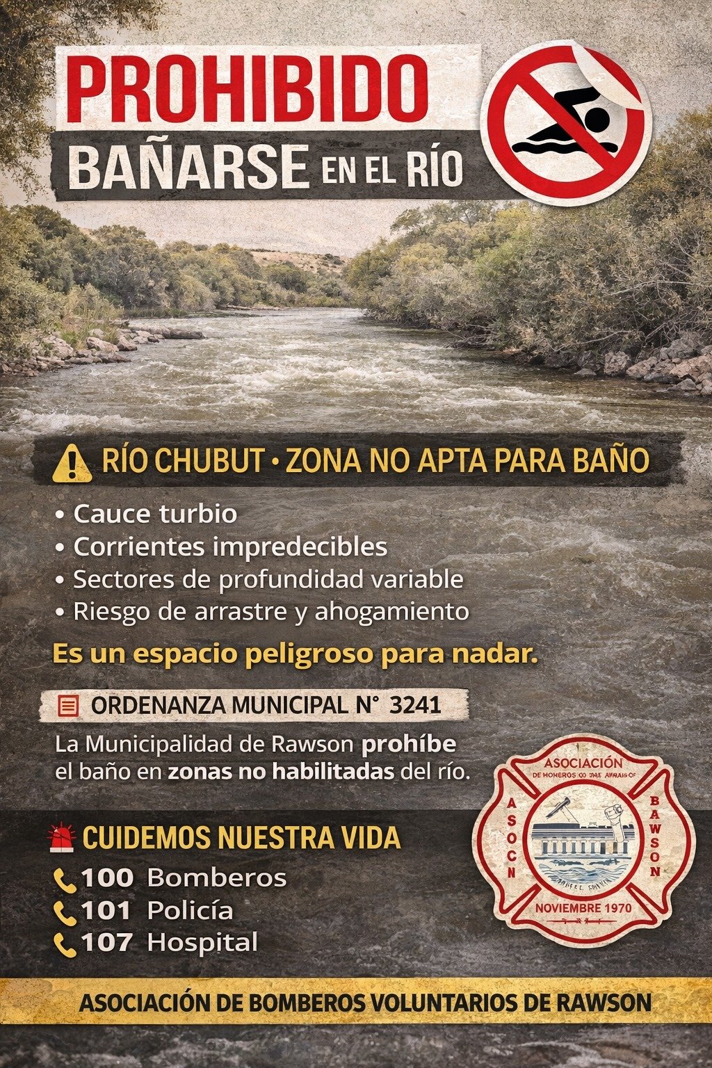 En el marco de la llegada de jornadas con altas temperaturas en la región, la Asociación de Bomberos Voluntarios de Rawson emitió un comunicado reforzando las medidas de prevención y advirtiendo a la comunidad sobre los riesgos de ingresar al Río Chubut.