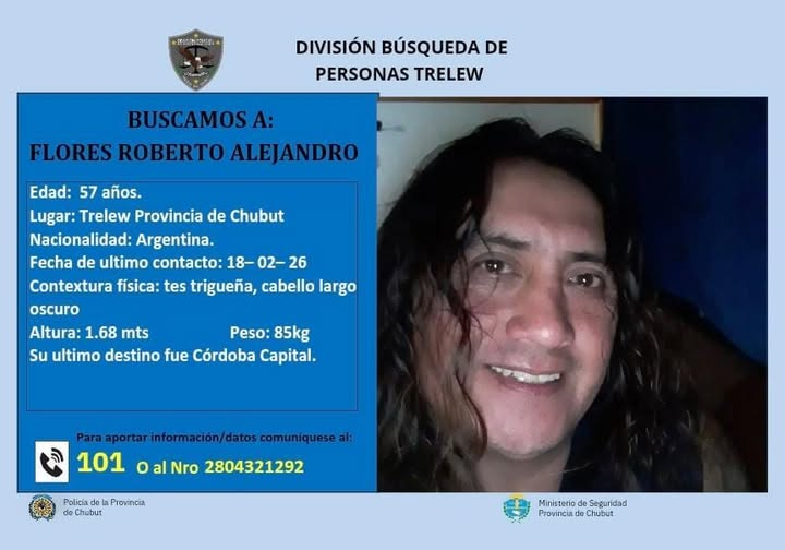 La División Búsqueda de Personas de Trelew activó un pedido de colaboración para dar con el paradero de Roberto Alejandro Flores, un hombre de 57 años que fue visto por última vez el 18 de febrero de 2026 en la ciudad de Trelew, provincia de Chubut.