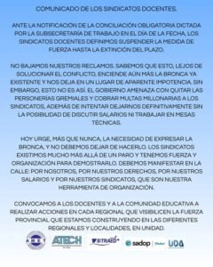 Además, convocaron a docentes y a la comunidad educativa a participar en acciones regionales para visibilizar el reclamo por salarios y condiciones laborales.