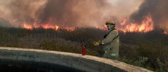 Las dotaciones trabajan intensamente para evitar que las llamas se propaguen hacia sectores linderos, en una zona descampada donde el viento favorece el avance del fuego.