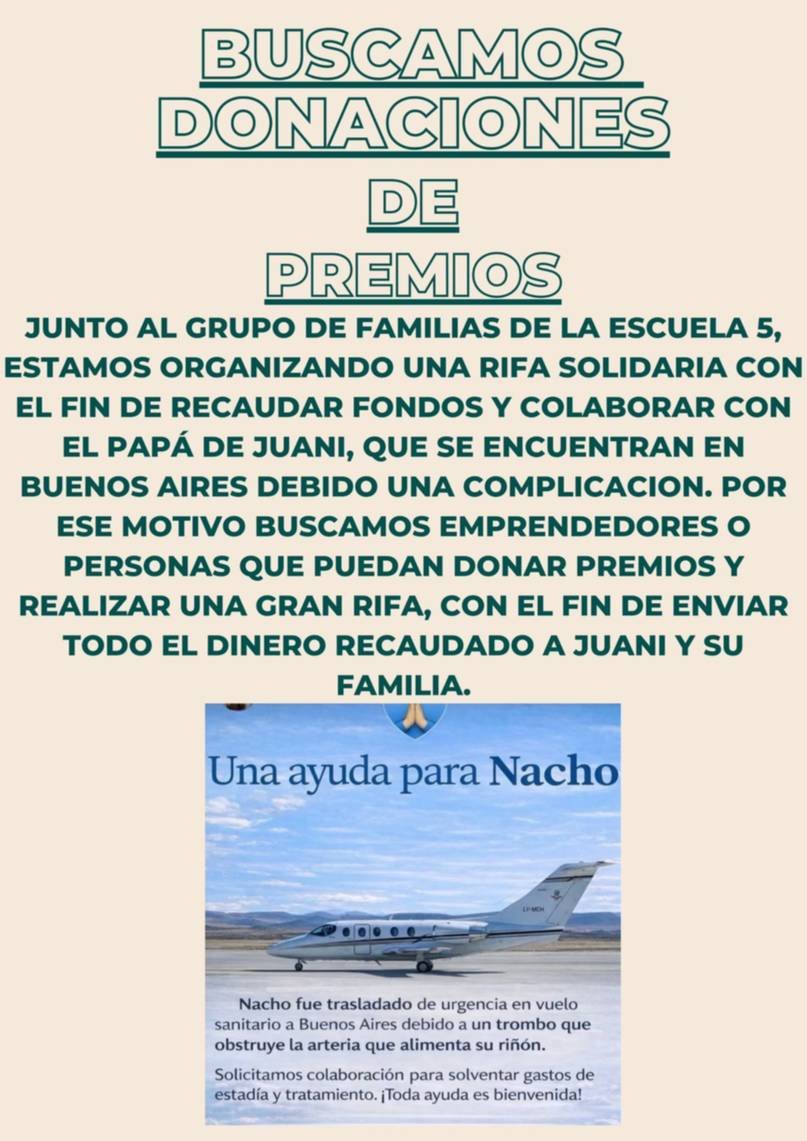 La iniciativa es impulsada por familias de la Escuela 5, institución a la que asiste el menor, quienes organizaron una rifa solidaria con el objetivo de recaudar fondos para colaborar con los gastos de estadía y tratamiento médico. El niño debió ser derivado a la capital del país debido a una complicación en su estado de salud, relacionada con un trombo que obstruye la arteria que alimenta su riñón.