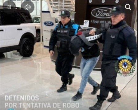 El hecho se registró cuando el Centro de Monitoreo alertó sobre la activación de sensores en el sector de techos del comercio. Al arribar, el personal policial observó a uno de los sospechosos descendiendo desde el techo hacia el salón del primer piso. Ante esta situación, los efectivos rompieron un cristal para ingresar al local y lograron reducirlo dentro del edificio.