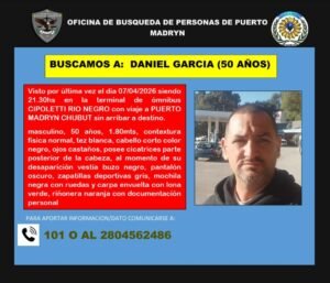 La Oficina de Búsqueda de Personas de Puerto Madryn lanzó un pedido urgente para dar con el paradero de Daniel García, de 50 años, quien fue visto por última vez el 7 de abril de 2026.