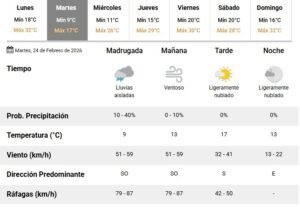 Durante la mañana continuará ventoso, con temperaturas cercanas a los 13°C y ráfagas en valores similares. Por la tarde el viento disminuirá su intensidad (entre 32 y 41 km/h), con cielo ligeramente nublado y una máxima estimada en 17°C. Hacia la noche, las condiciones tenderán a mejorar.