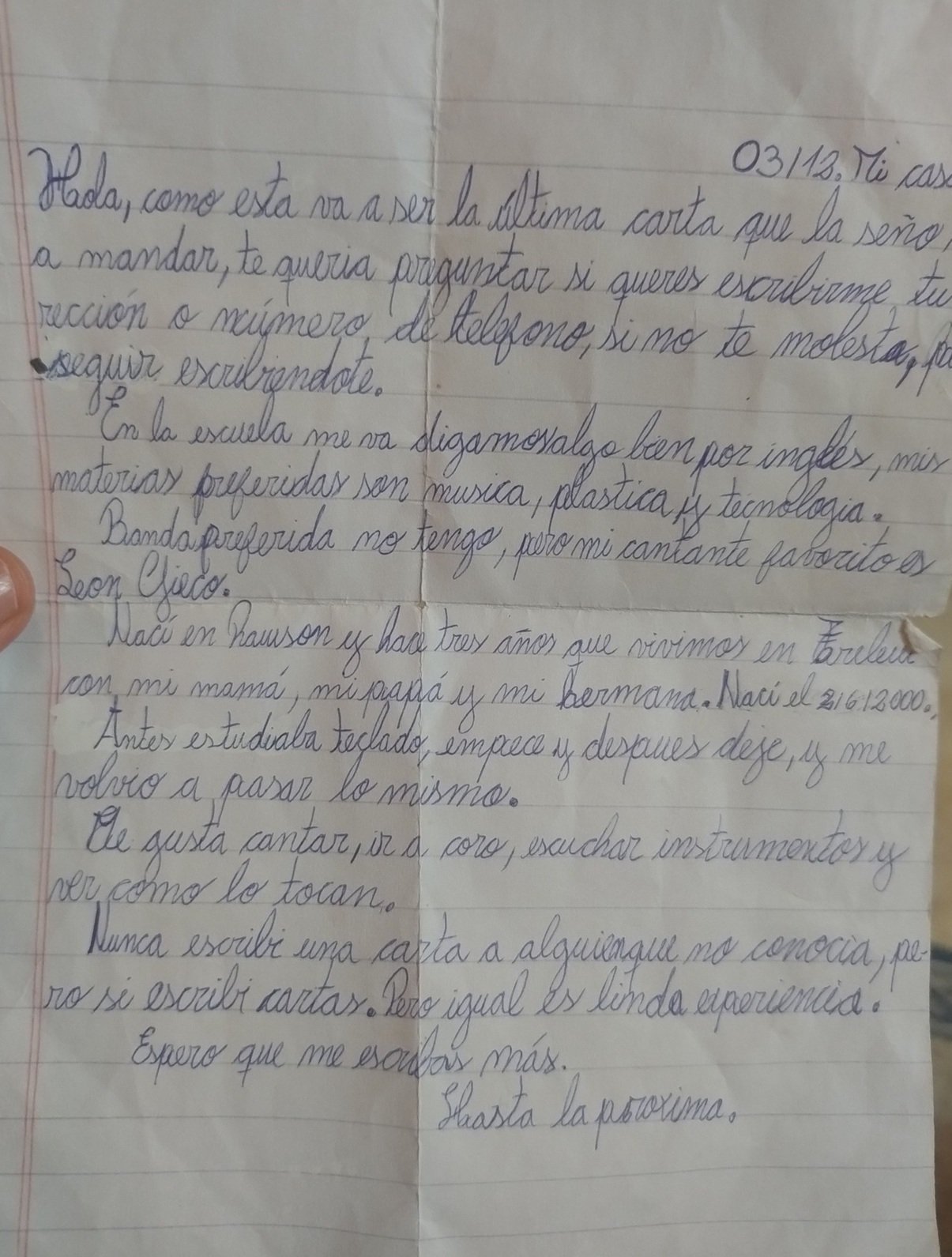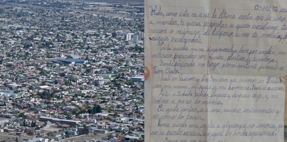 Según explicó, el mensaje formaba parte de un intercambio entre colegios en el marco de una actividad de lengua durante la secundaria. De acuerdo a los datos que aparecen en la carta, quien la escribió nació en Rawson el 2 de junio de 2000 y, en ese momento, vivía en Trelew.